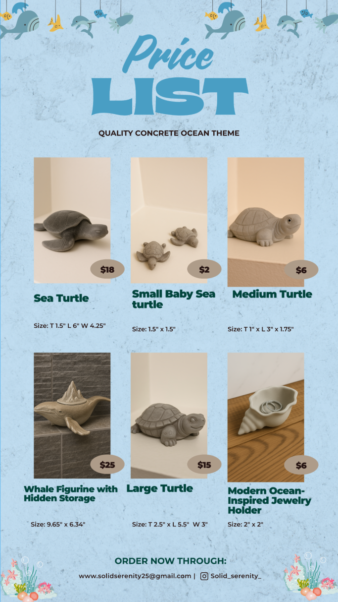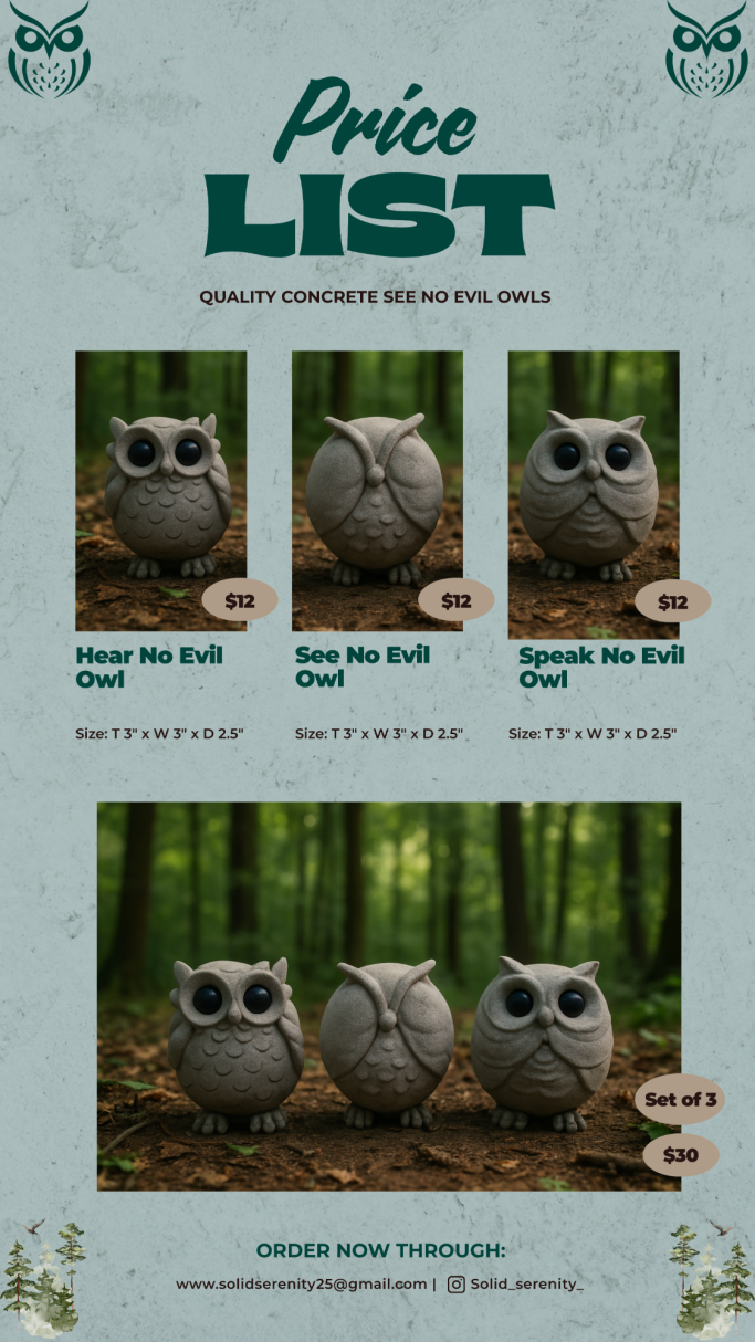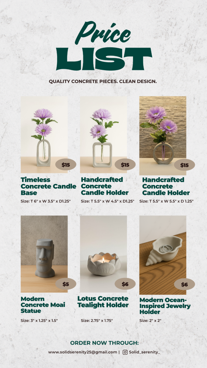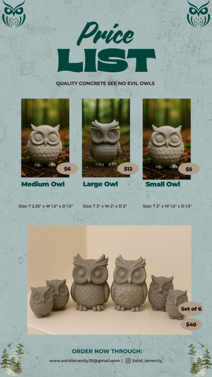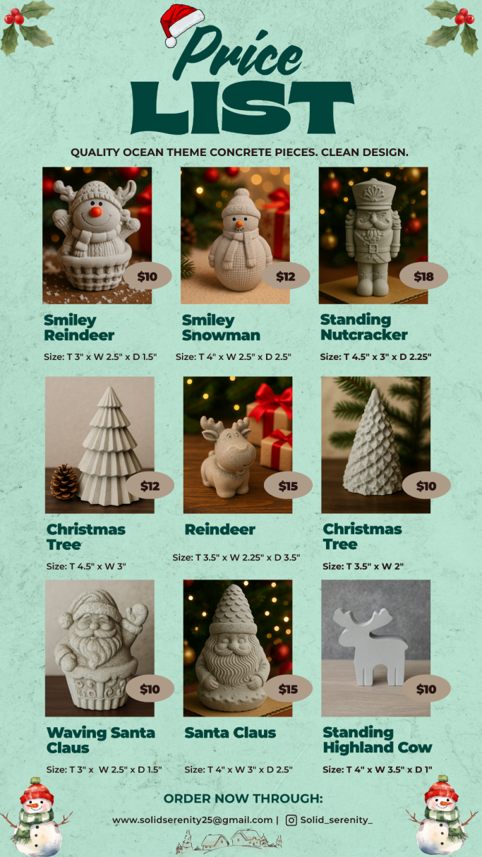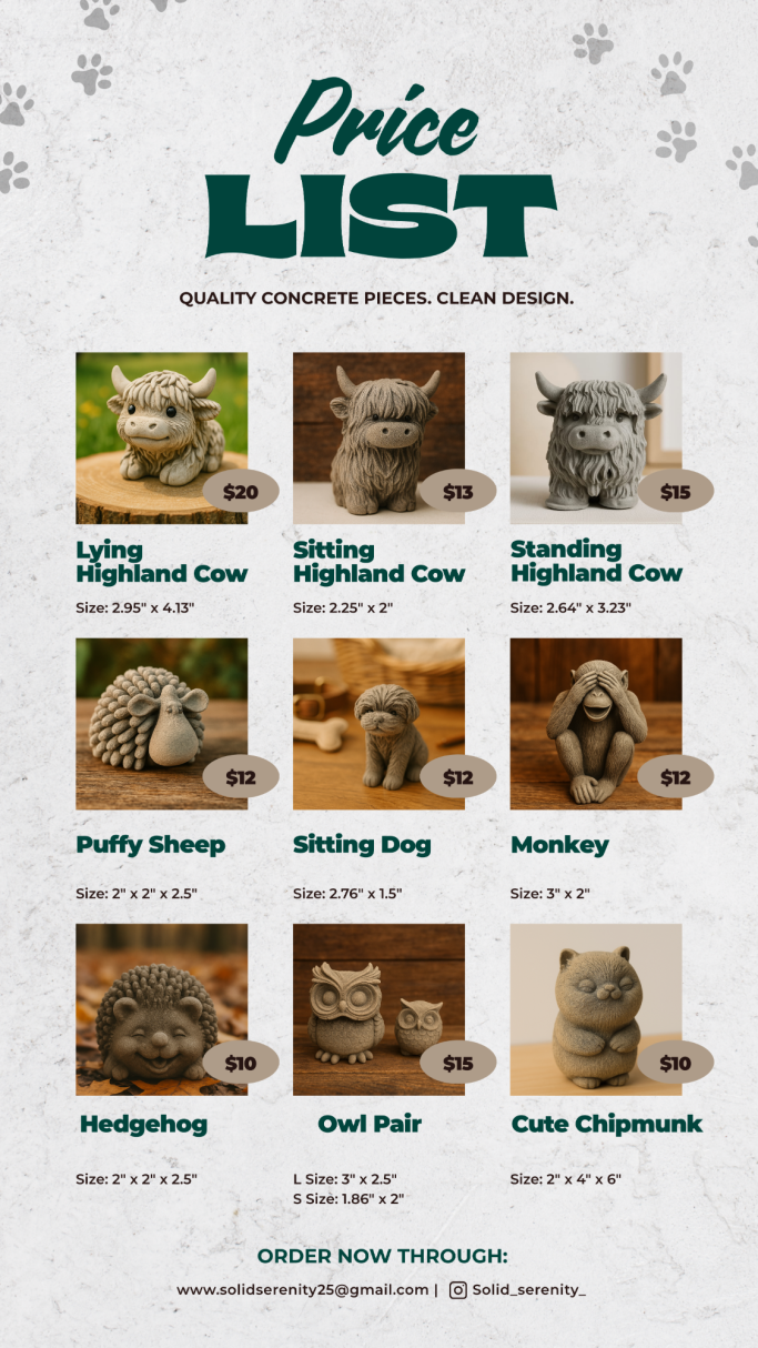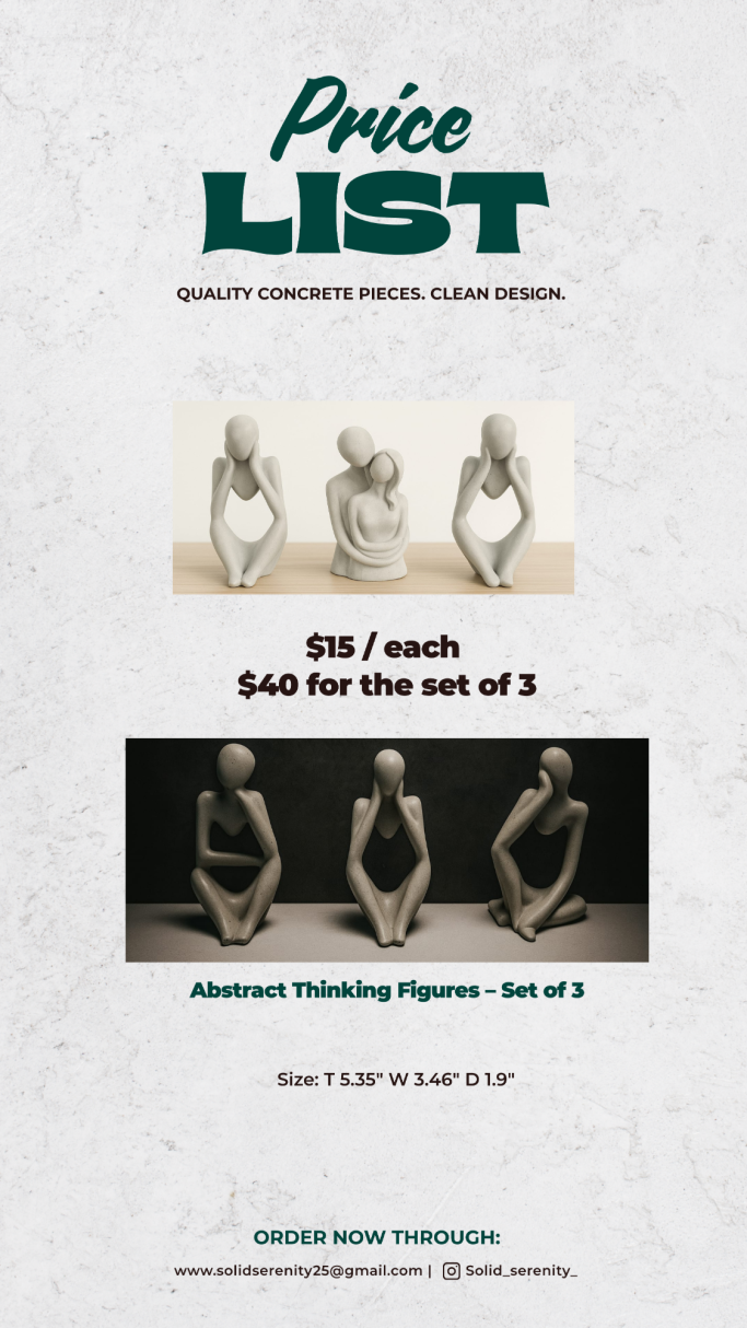 Solid Serenity is my mom’s concrete business, where she brings creativity and craftsmanship to life with unique, handmade pieces. From decorative figures and statues to practical home décor, each item is designed with care to add beauty and durability to any space.