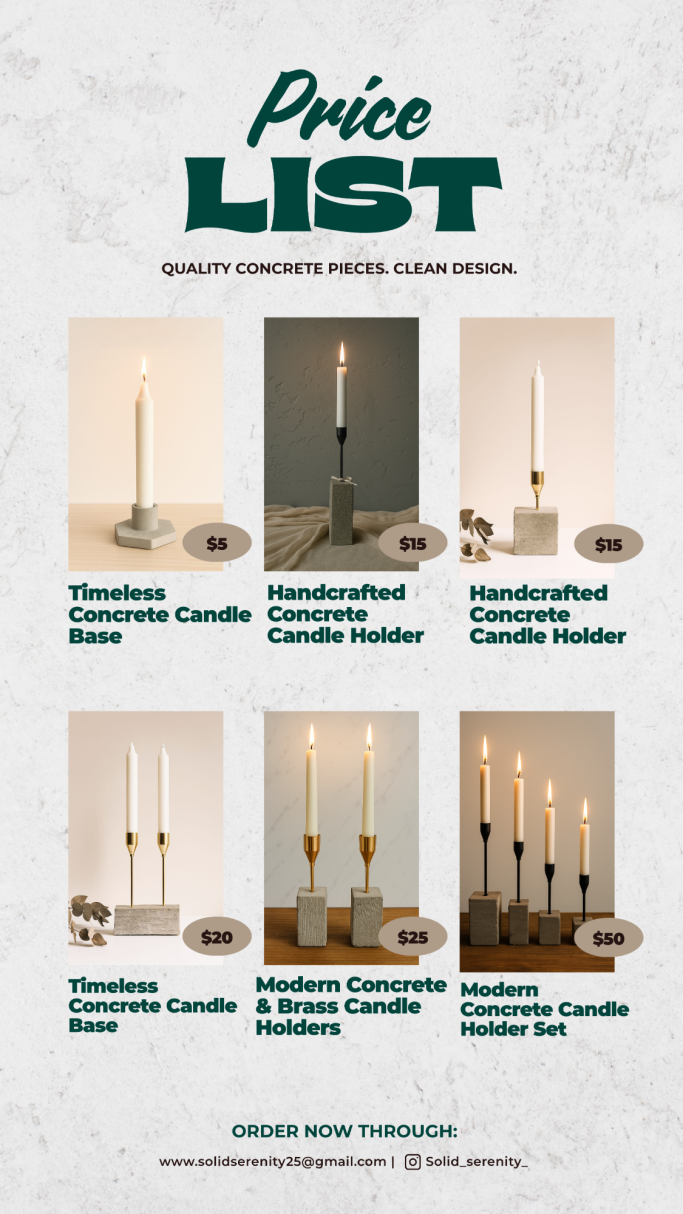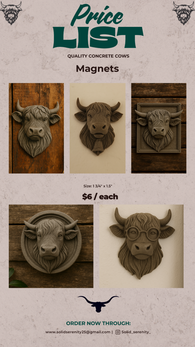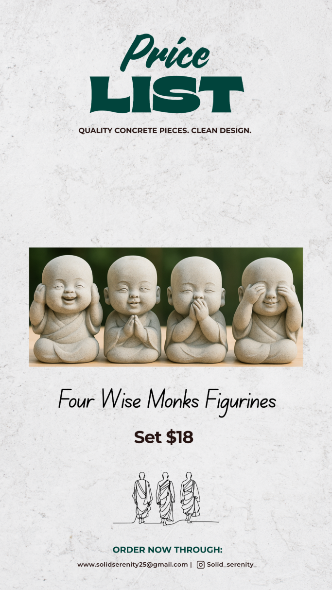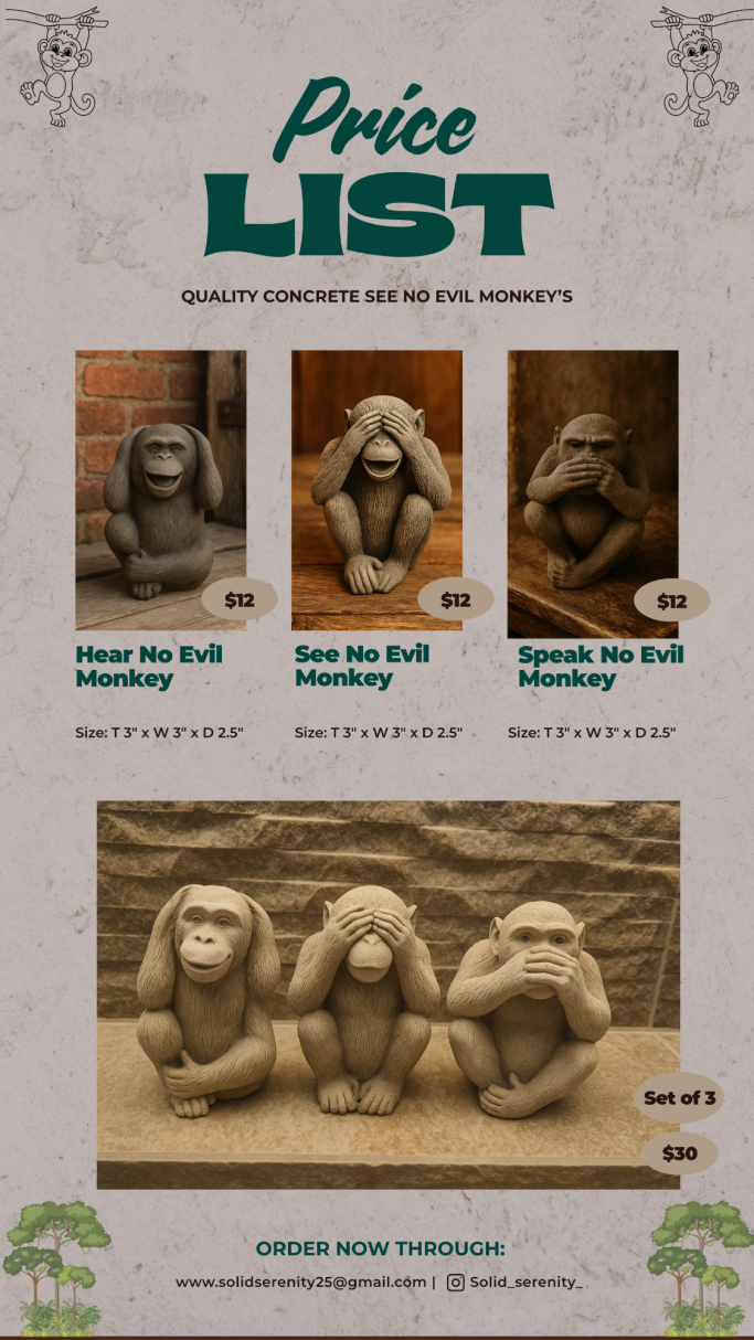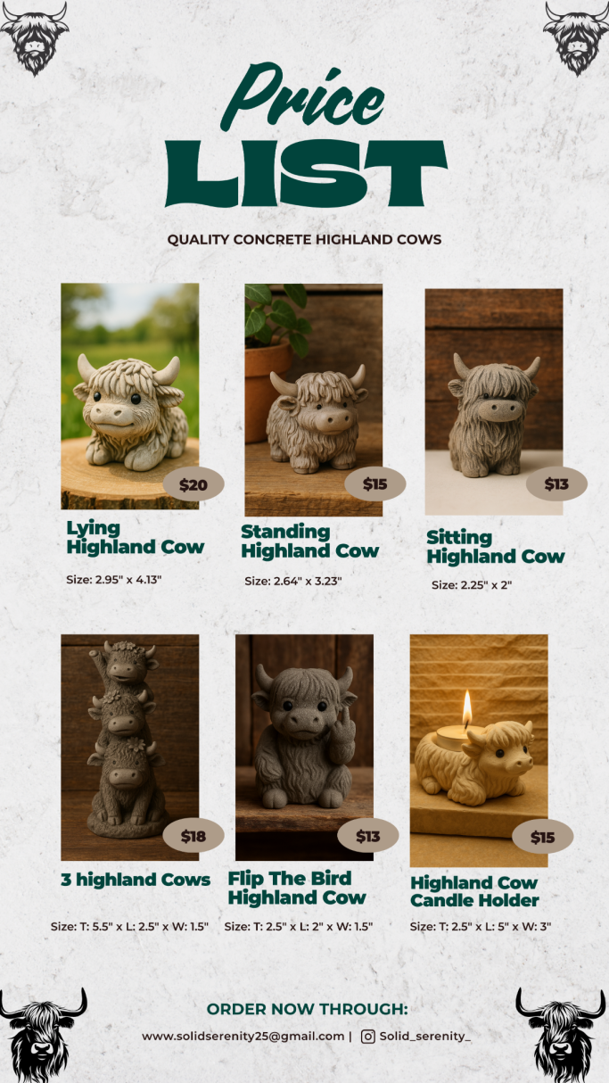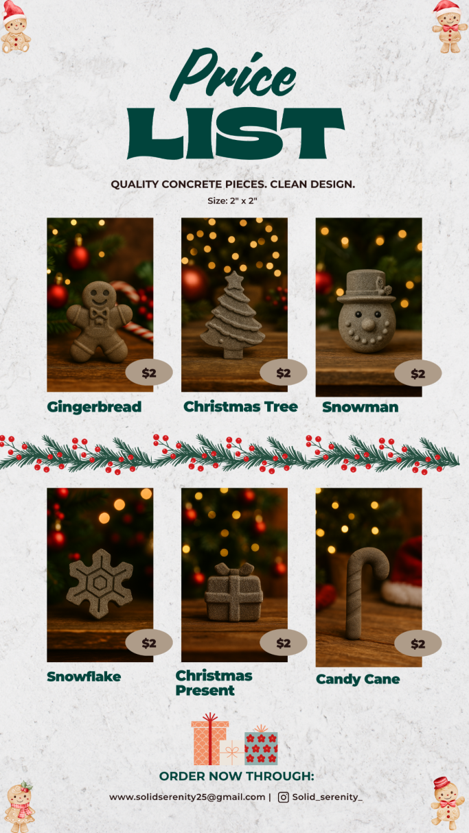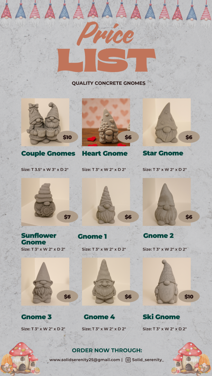Solid Serenity is my mom’s concrete business, where she brings creativity and craftsmanship to life with unique, handmade pieces. From decorative figures and statues to practical home décor, each item is designed with care to add beauty and durability to any space.